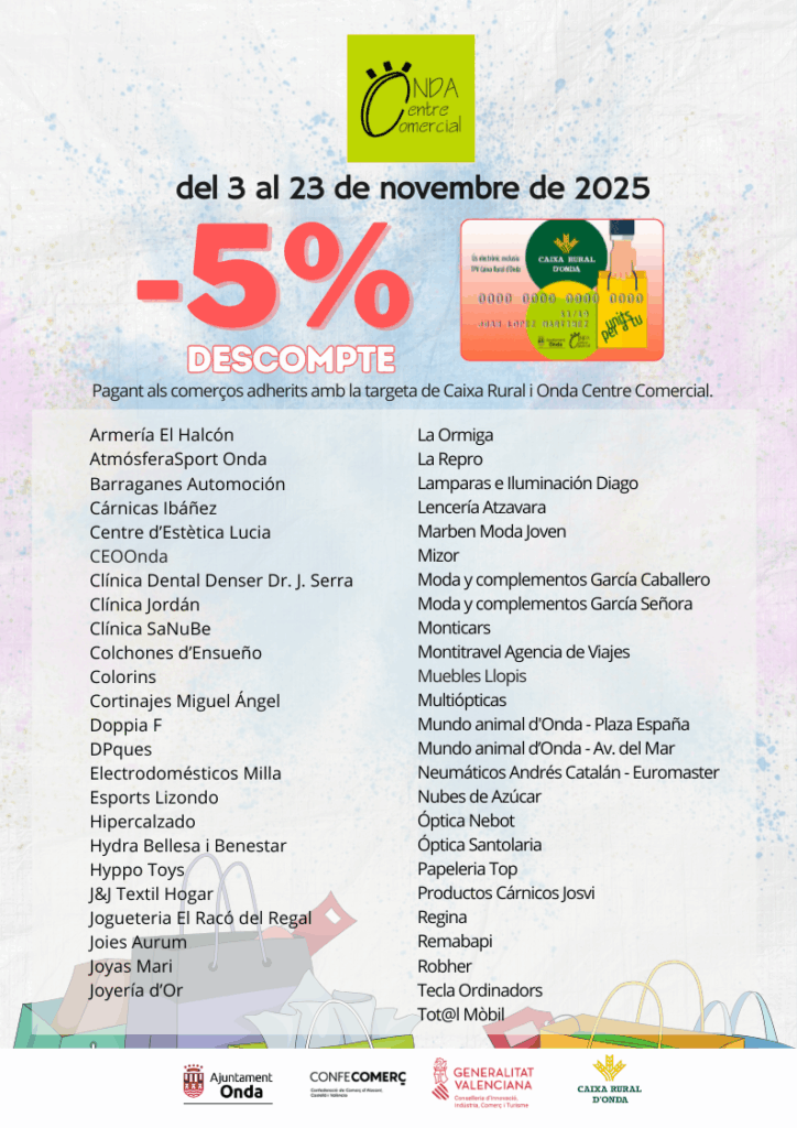 Del 3 al 23 de noviembre de 2025, los clientes que paguen en los comercios adheridos con la tarjeta de Caixa Rural Onda – Onda Centre Comercial disfrutarán de un 5% de descuento directo en sus compras. 💳 🛒 Más de 50 comercios de todos los sectores participan en esta campaña: moda, alimentación, ópticas, estética, […]
